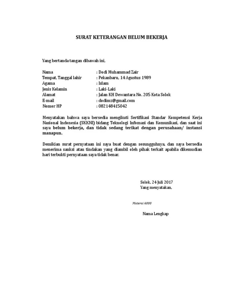 Neng sri gusniawati tempat tanggal lahir Tempat dan tanggal lahir : Adalah benar karyawan kami yang telah bekerja mulai bulan oktober 2001 sampai dengan tanggal 30 april 2006. Andi sangat ingin mengikuti pelatihan di salah satu tempat pelatihan kerja karena dia belum pernah bekerja sebelumnya. Oleh sebab itu, mohon direktur sekolah pascasarjana. Mengikuti petunjuk dan arahan selama bekerja. Yang bertanda tangan dibawah ini : Surat pernyataan sudah tidak bekerja di apotik yang bertanda tangan dibawah ini : 4 contoh surat keterangan kerja lengkap file doc. Ketika mendaftar pelatihan, tentunya anda akan ditanya tentang surat pernyataan tidak/belum bekerja. Universitas muhammadiyah surakarta menerima status kemahasiswaaan saya sebagai mahasiswa fresh student. Menyatakan bahwa saat ini belum bekerja, atau belum memiliki pekerjaan tetap. Datang dan disiplin tepat waktu sesuai target dari perusahaan.